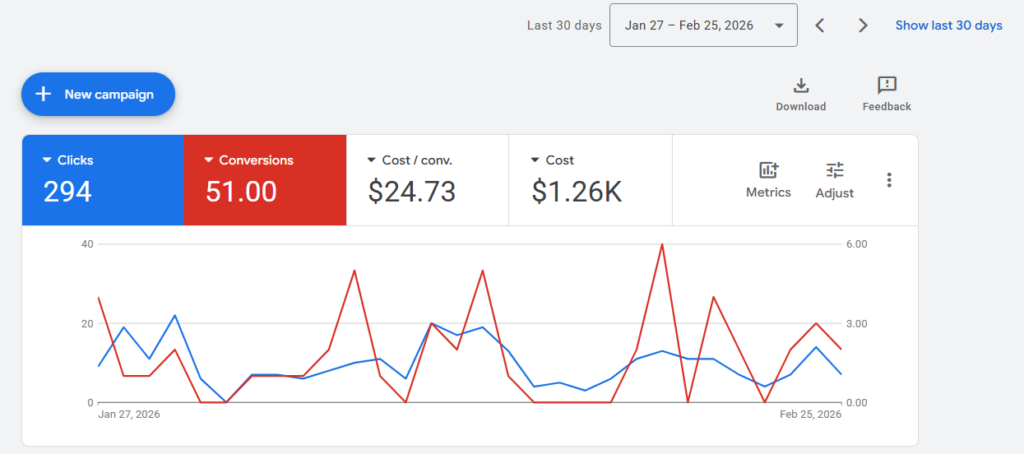 The Google Ads campaign improved slightly from last month, reaching 53 conversions while keeping ad spend at a reasonable level. These are strong results in a very competitive market and show that the campaign is continuing to generate solid lead volume efficiently.