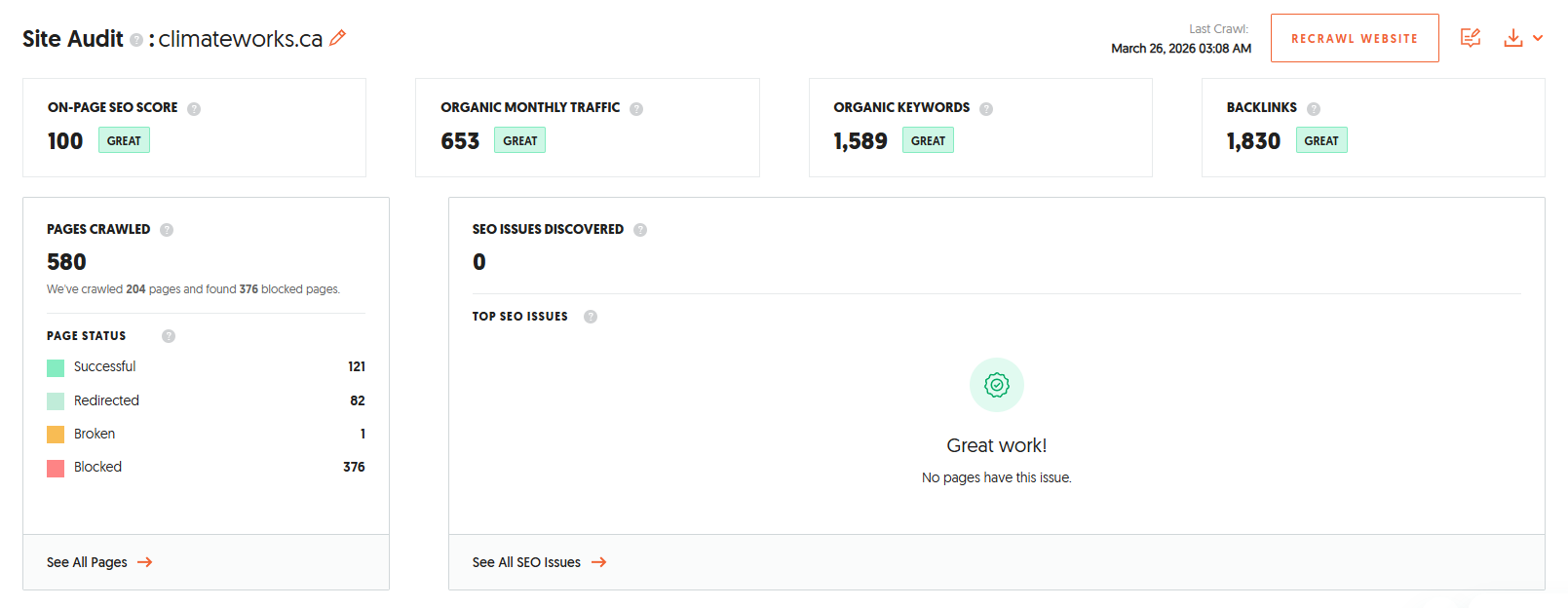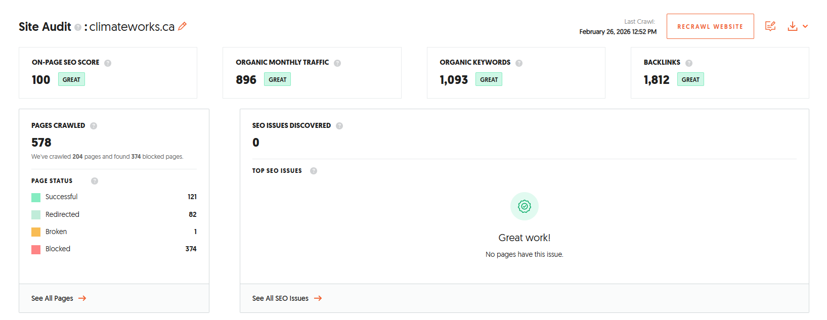 We continue to maintain a perfect 100/100 technical SEO score, with no broken links or 404 pages detected. Each month, we monitor crawlability, fix any indexing issues, review redirects, and ensure the site structure remains clean and efficient. We also keep an eye on page speed, internal linking, and overall site health to make sure Google can easily crawl and index all key pages, supporting consistent ranking growth.