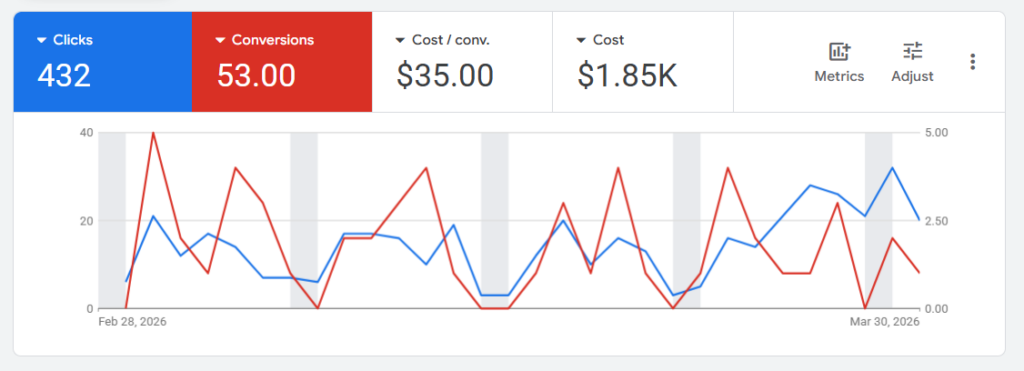 In March, we launched a new AI chatbot trained on your services, phone number, and key pages to help capture leads directly on the site, while also preparing a Spring HVAC Google Ads campaign set to go live in early April. Click-through rate and conversion performance remained strong, generating 432 clicks and 53 lead conversions at an efficient $35 cost per conversion, showing solid lead quality and engagement.