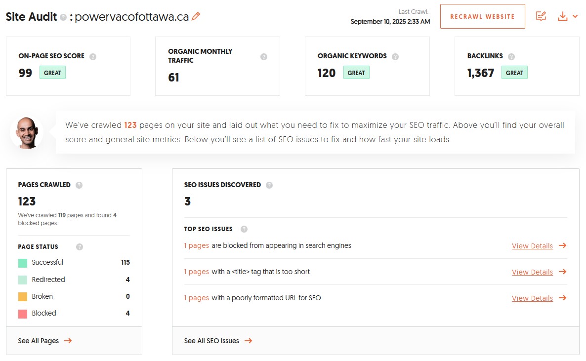 These gains indicate that the site is now capturing traffic across Ontario and beyond, expanding visibility far outside Ottawa. Locally, improvements such as Power Vac Ontario (+3), Power Vac Duct Cleaning (+2), and Duct Cleaners Ottawa (+15) also show healthy upward movement.