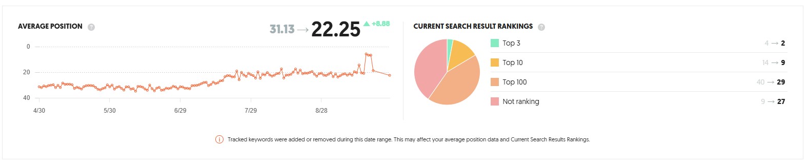 Over the past six months, we’ve seen a steady and meaningful improvement in your organic search performance. PowerVac’s average keyword position has improved from 31.13 to 22.25, which is a jump of nearly 9 positions overall. This reflects consistent upward movement in the rankings and stronger visibility across your tracked keywords. In addition, we’ve increased the number of keywords ranking in the Top 10 and Top 100, with fewer keywords falling outside of ranking positions.